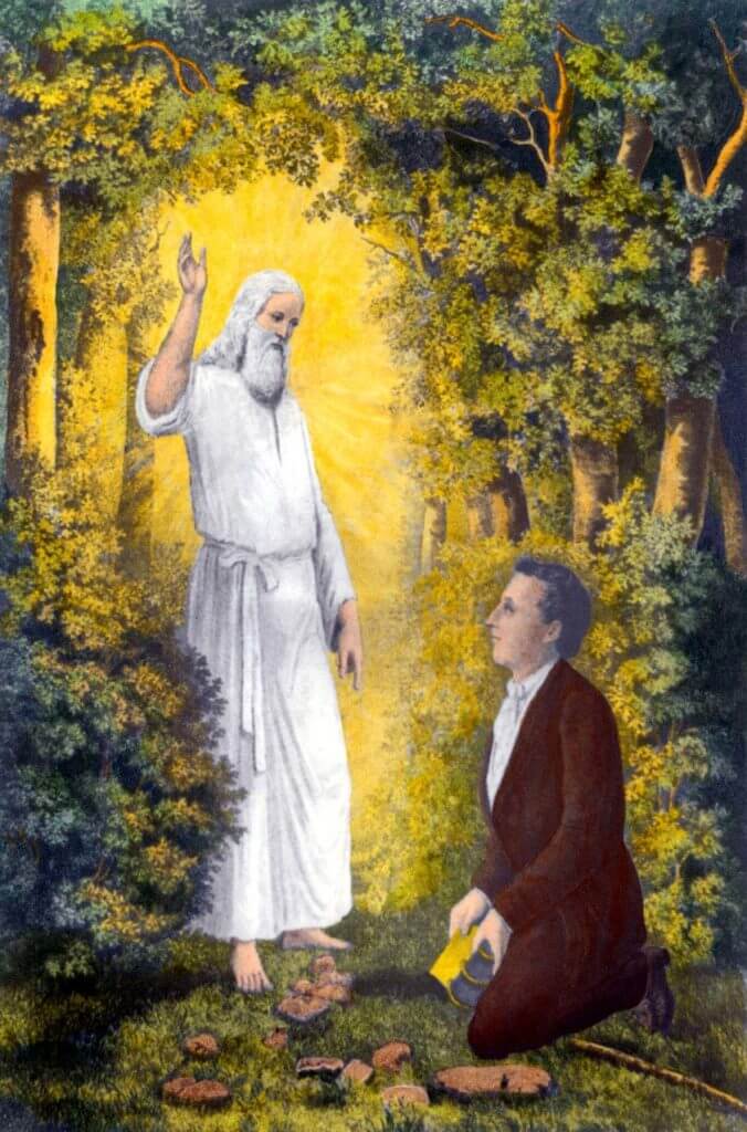 “Quando a luz pousou sobre mim, vi dois Personagens cujo esplendor e glória estavam acima de qualquer descrição, pairando acima de mim no ar. Um deles falou-me, chamando-me pelo nome, e disse, apontando para o outro – “este é o meu Filho amado. Ouça-o!’1
